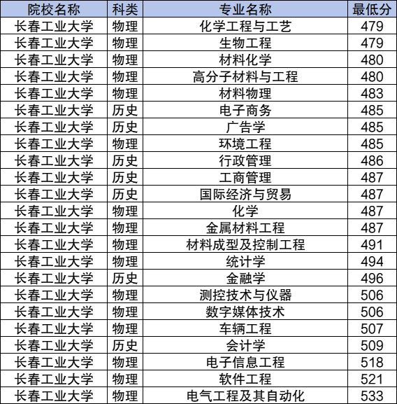 7、长春工业大学:历史类最低485分;物理类最低479分