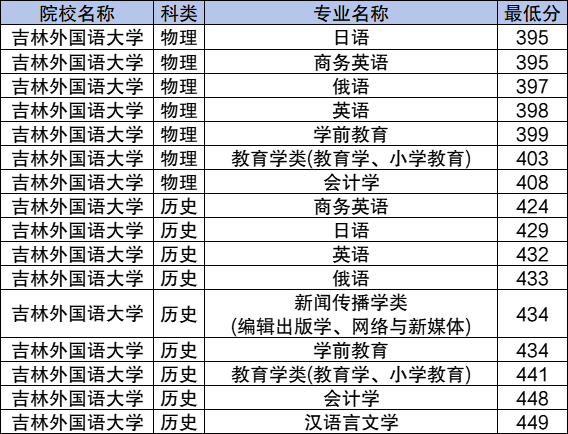 学校地方专项计划历史类最低分数线是424分,对应的招生专业是商务英语;物理类最低分数线是395分,对应的招生专业是日语。