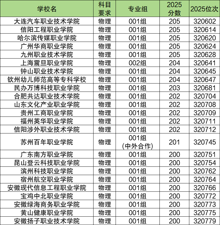 2025年安徽物理类专科线附近(200分到205分)能上的高职(专科)院校一共有24个,排名靠前的有大连汽车职业技术学院(001组,320602名)、信阳工程职业学院(001组,320614名)、哈尔滨传媒职业学院(001组,320620名)等,这些属于专科线附近考生可以冲一冲的学校。