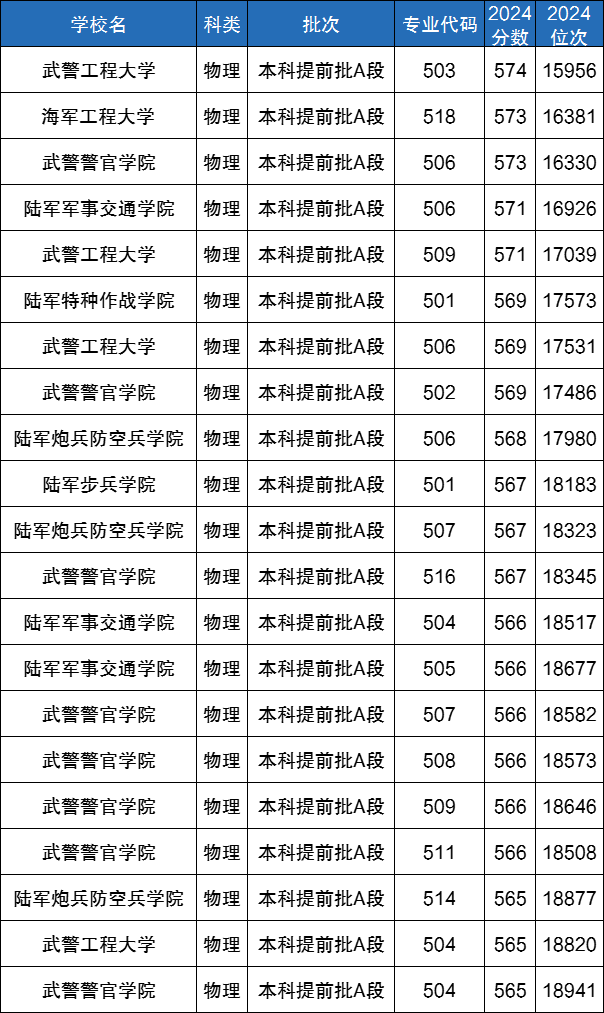 2024年贵州省的570分左右(565-575分)能上的军校一共有7所,均为本科提前批A段录取的院校。