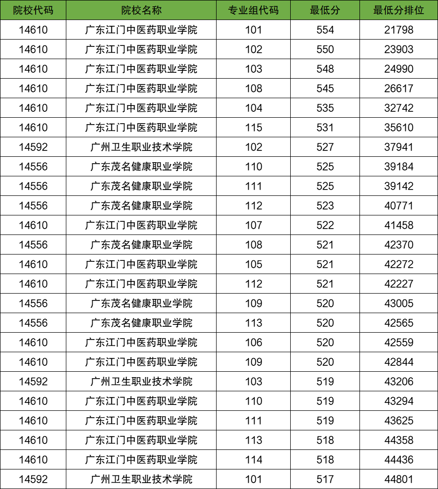 分数线较低的农村卫生专项计划大学还有广东江门中医药职业学院(518分)、广东茂名健康职业学院(520分)等。