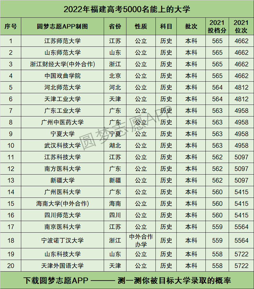 1、本文由于篇幅有限,仅为大家展示了2021年福建高考最低录取位次在5千名附近的20所大学。如果你想查看更多能上的大学,可以直接在手机应用市场下载圆梦志愿APP,获取推荐结果。