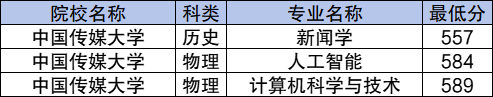 学校国家专项计划历史类最低分数线是557分,对应的招生专业是新闻学;物理类最低分数线是584分,对应的招生专业是人工智能。