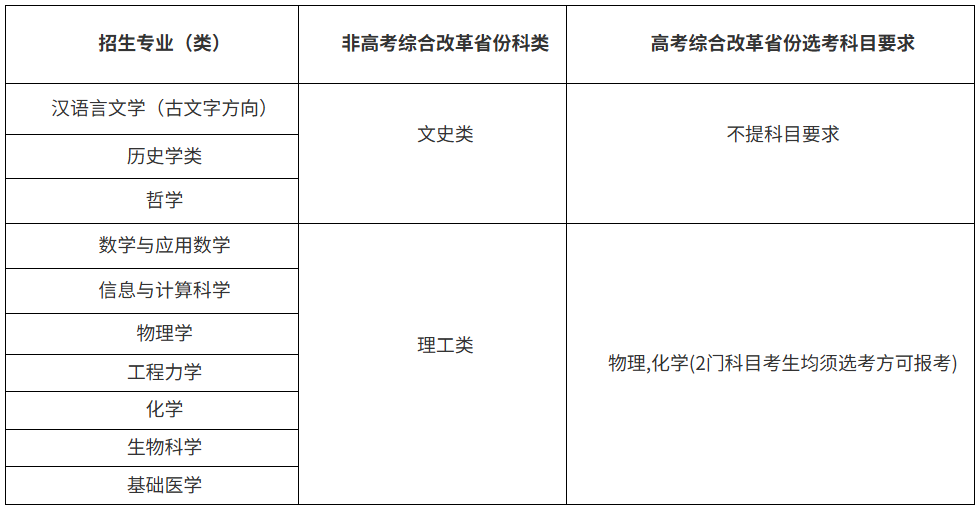 学校强基计划招生专业为汉语言文学(古文字方向)、历史学类(含历史学、考古学、文物与博物馆学专业)、哲学、数学与应用数学、信息与计算科学、物理学、工程力学、化学、生物科学、基础医学。