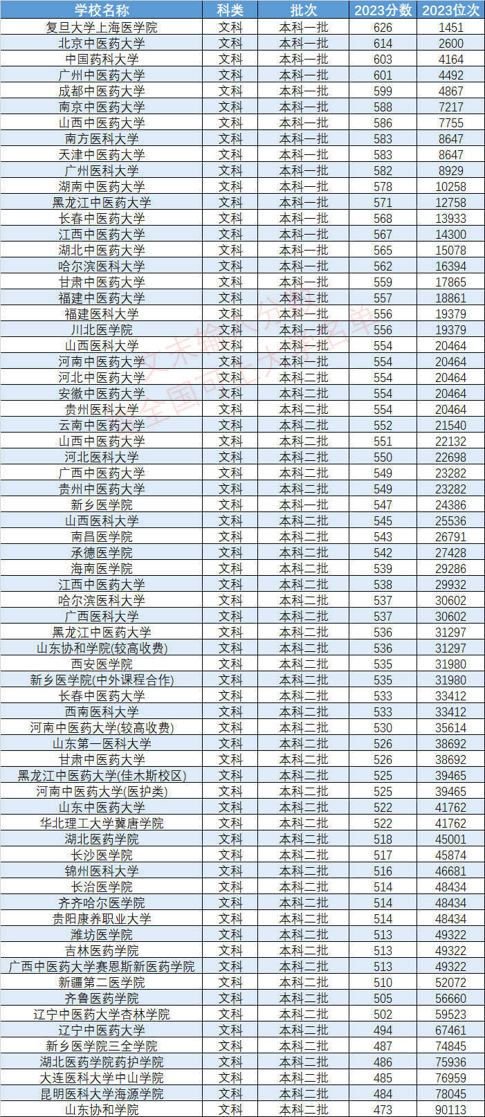 文科录取最高的大学是复旦大学上海医学院,录取分数为626分;录取分数最低的是山东协和学院,录取分数为473分。除了录取分数最高复旦大学上海医学院外,的文科录取分数超过600分的院校还有3所,分别是北京中医药大学614分、中国药科大学603分、广州中医药大学601分。