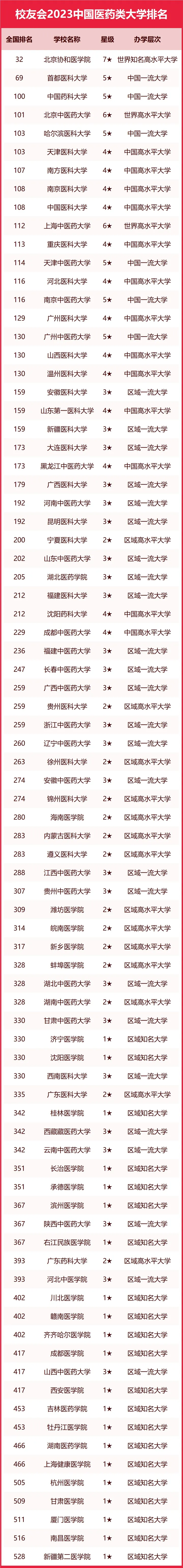 各榜单医学院校排名各不相同,老师以校友会发布的数据出发,从校友会2023年发布的医药类大学院校排名来看,上榜的医学院校一共有82所,医药类排名第一的是北京协和医学院,同时也在全国院校排名中第32名,第二第三的分别是首都医科大学、中国药科大学。