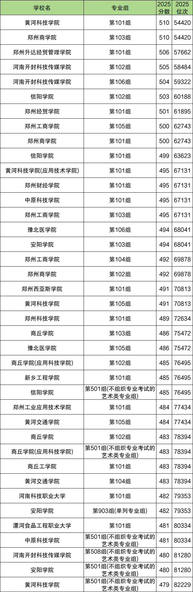 2025年位于河南且在省内历史类招生的民办本科大学一共有22所,其中分数线最低的是黄河科技学院,2025年最低分是479,对应招生专业组为第501组(不组织专业考试的艺术类专业组)。