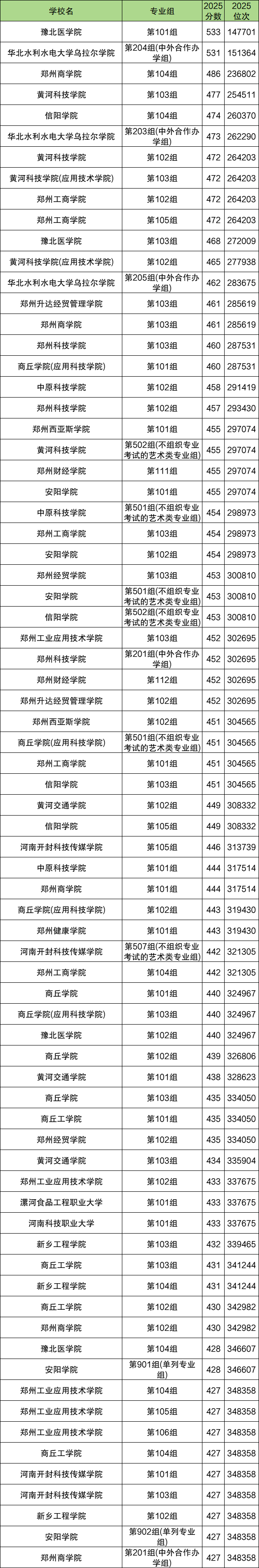 2025年位于河南且在省内物理类招生的民办本科大学一共有24所,其中分数线最低的有郑州工业应用技术学院、商丘工学院、新乡工程学院、郑州商学院等,2025年最低分是427,对应专业组详见下表。