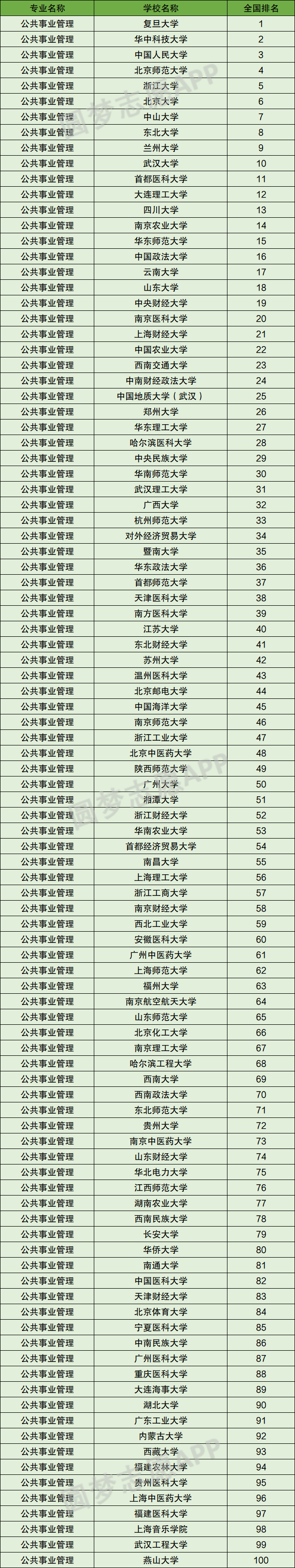 以下为软科中国大学专业排名中,公共事业管理专业前100名大学。