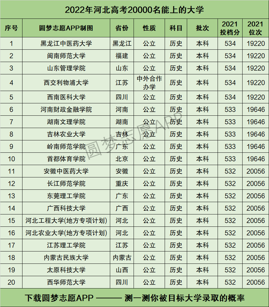 1、本文由于篇幅有限,仅为大家展示了2021年河北高考最低录取位次在两万名附近的20所大学。如果你想查看更多能上的大学,可以直接在手机应用市场下载圆梦志愿APP,获取推荐结果。