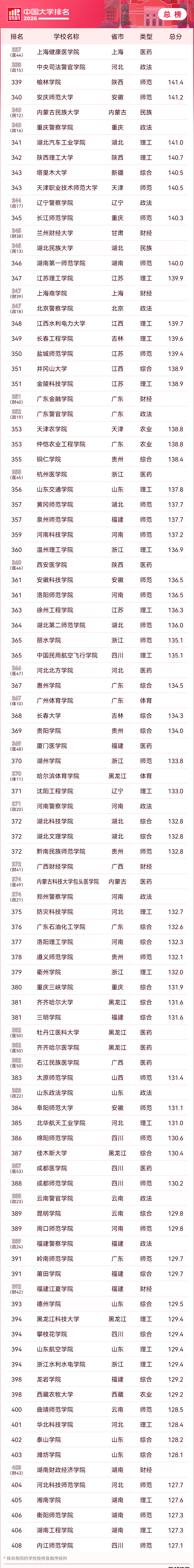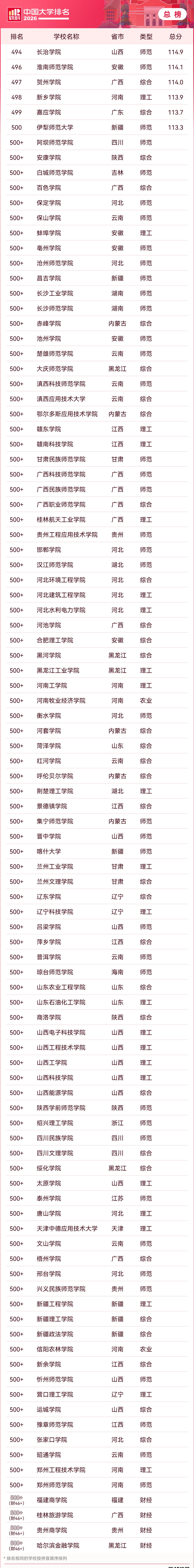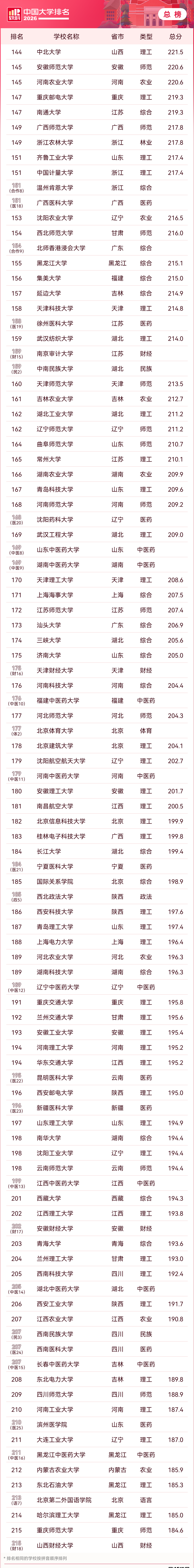 以下为软科2026年中国大学排行榜完整版名单,考生可滑动查看各高校排名情况: