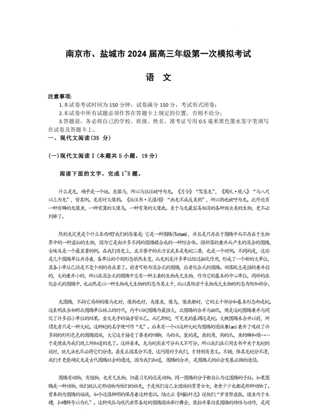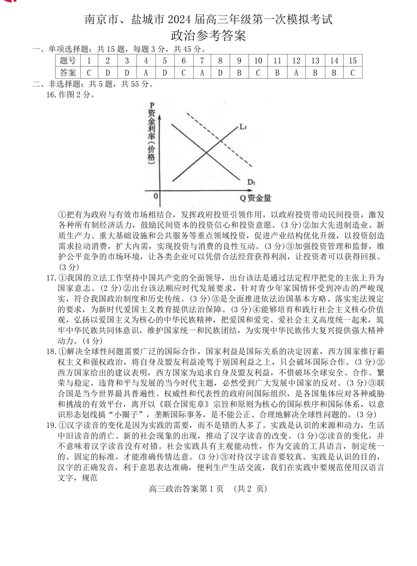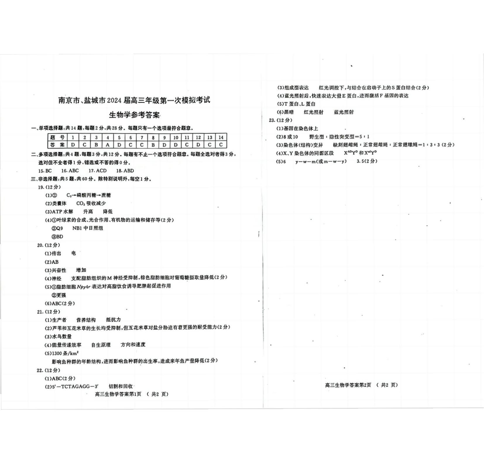 2024南京一模各科试题及答案