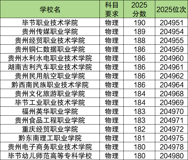 2025年贵州物理类专科线附近(180分到190分)能上的高职(专科)院校一共有16个,排名靠前的有毕节职业技术学院(204951名)、贵州传媒职业学院(204954名)、贵州经贸职业技术学院(204955名)等,这些属于专科线附近考生可以冲一冲的学校。
