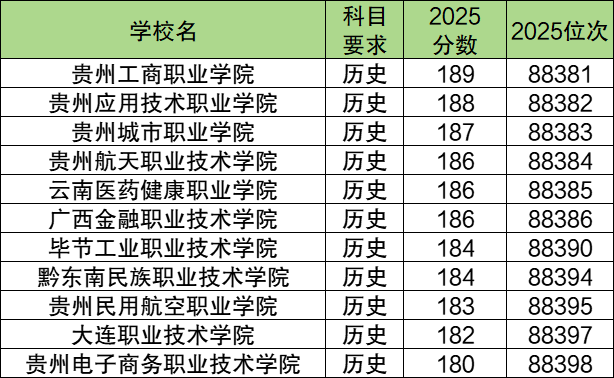 下面是2025年贵州历史类专科线附近能上的专科院校名单一览表: