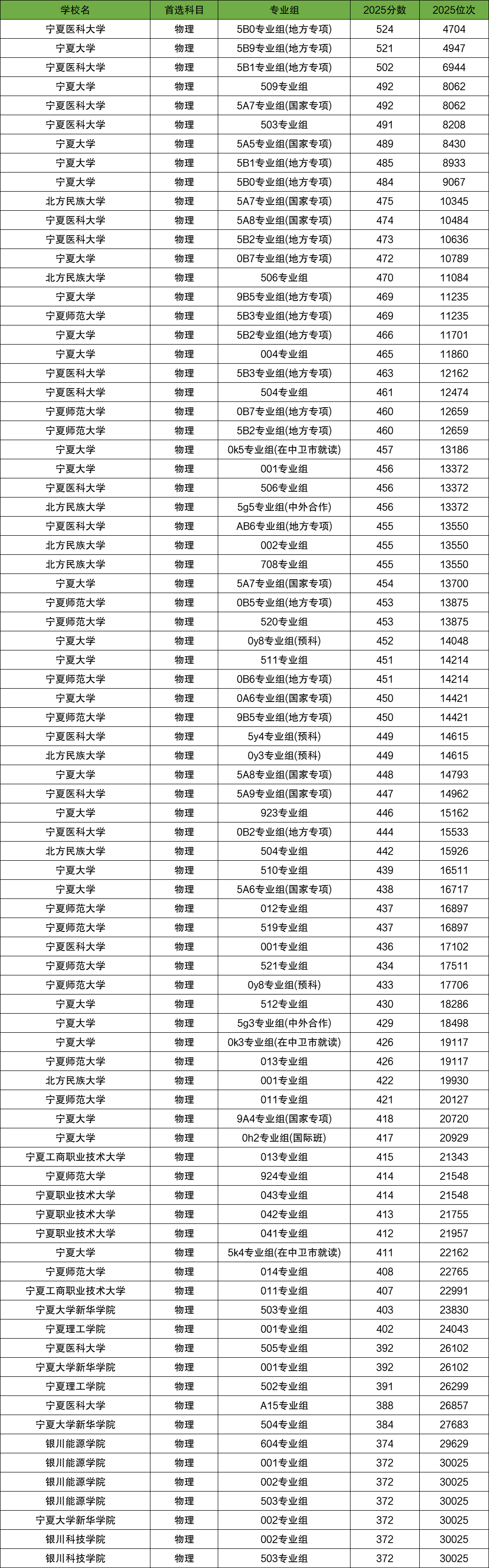区内分数最高的大学是宁夏医科大学(5B0专业组,地方专项),2025年录取分数线为524分,对应最低位次为4704名。这也是宁夏物理类考生最难考的大学之一。