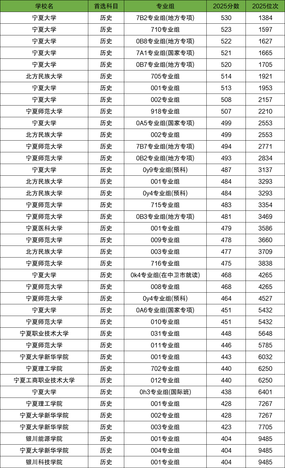 区内分数最高的大学是宁夏大学(7B2专业组,地方专项),2025年录取分数线为530分,对应最低位次为1384名。这也是宁夏内历史类考生最难考的大学之一。