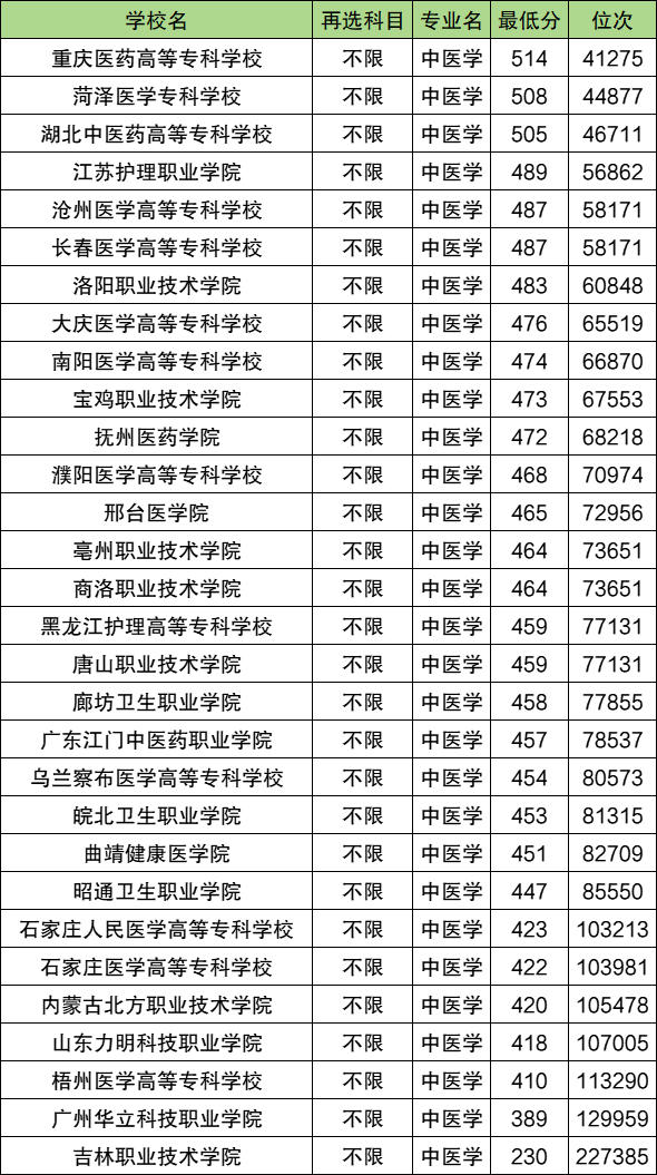 2025年中医学专科录取分数线整体位于230分到55149分之间,录取分数线最高的是重庆医药高等专科学校、录取分数线最低的是吉林职业技术学院。