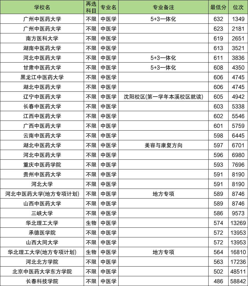 2025年中医学本科录取分数线整体位于486分到632分之间,录取分数线最高的是广州中医药大学(5+3一体化)、录取分数线最低的是长春科技学院。