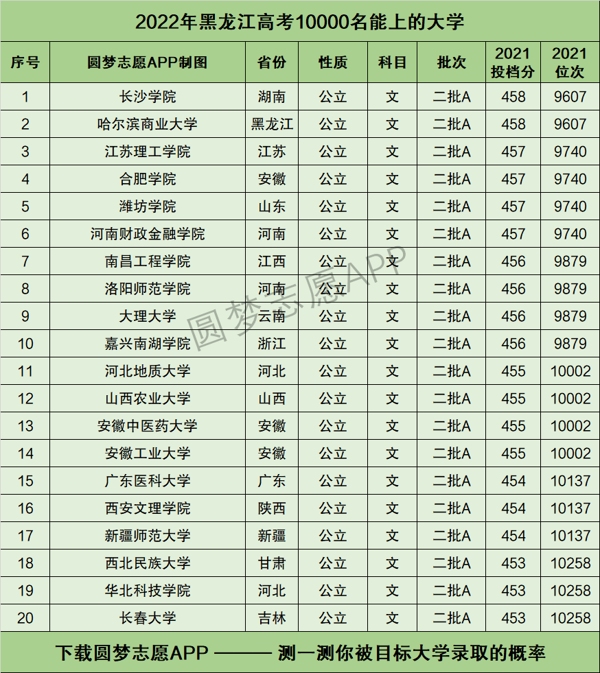 1、本文由于篇幅有限,仅为大家展示了2021年黑龙江高考最低录取位次在一万名附近的20所大学。如果你想查看更多能上的大学,可以直接在手机应用市场下载圆梦志愿APP,获取推荐结果。