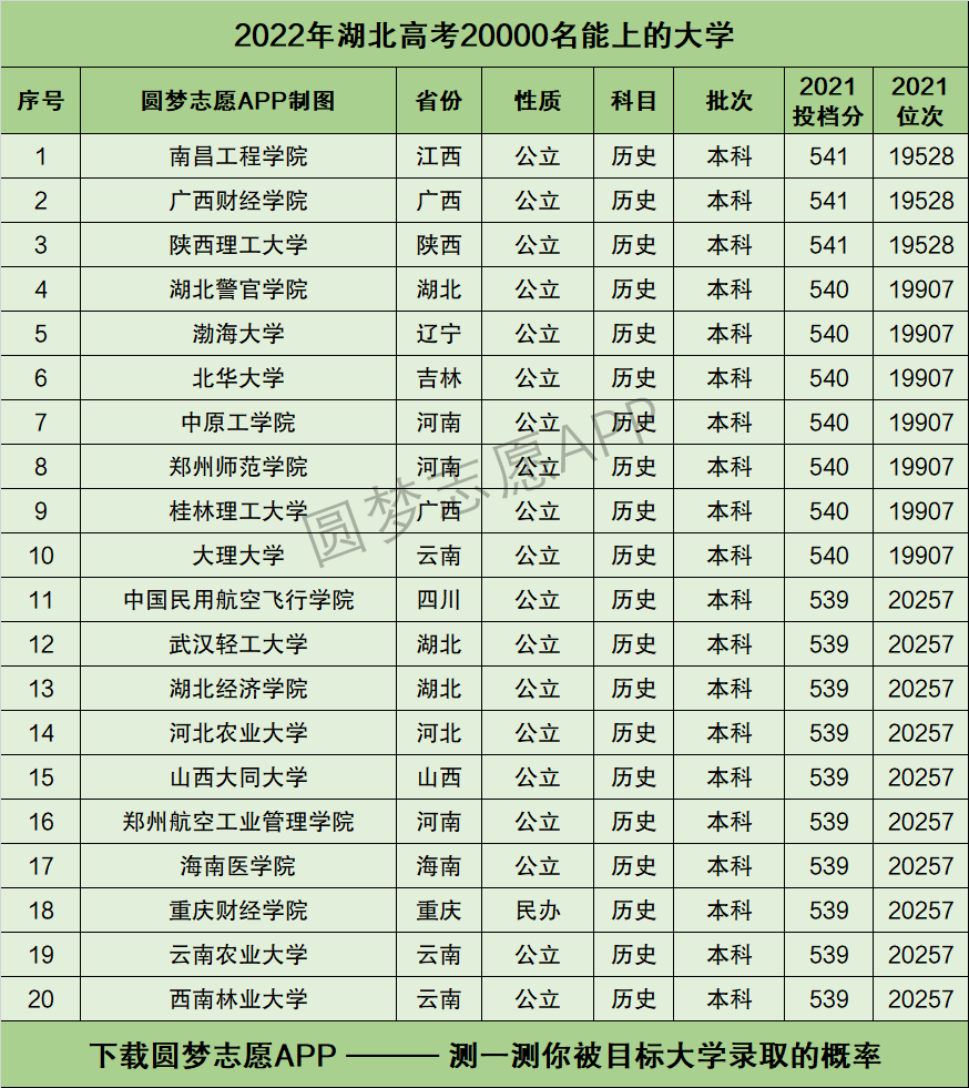 1、本文由于篇幅有限,仅为大家展示了2021年湖北高考最低录取位次在两万名附近的20所大学。如果你想查看更多能上的大学,可以直接在手机应用市场下载圆梦志愿APP,获取推荐结果。