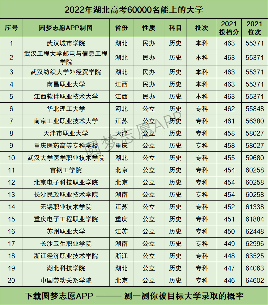 1、本文由于篇幅有限,仅为大家展示了2021年湖北高考最低录取位次在六万名附近的20所大学。如果你想查看更多能上的大学,可以直接在手机应用市场下载圆梦志愿APP,获取推荐结果。