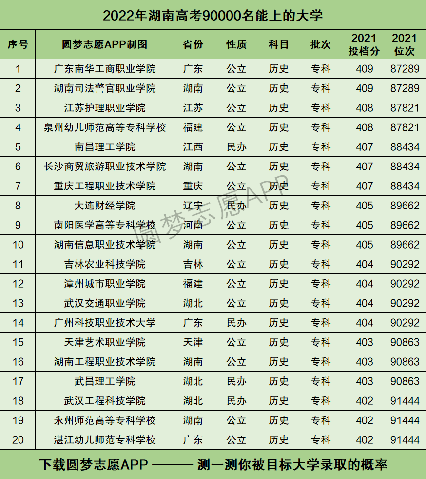 1、本文由于篇幅有限,仅为大家展示了2021年湖南高考最低录取位次在九万名附近的20所大学。如果你想查看更多能上的大学,可以直接在手机应用市场下载圆梦志愿APP,获取推荐结果。