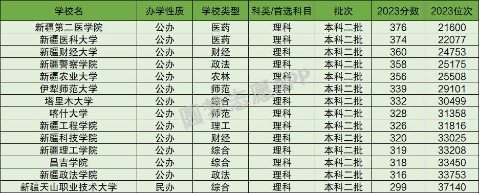 圆梦志愿为大家整理了2023年新疆所有二本大学的分数线及位次,可以看出新疆理科中分数最高实力最好的二本大学是新疆第二医学院,2023年在新疆最低分为376分,新疆全维吾尔自治区最低位次为21600。