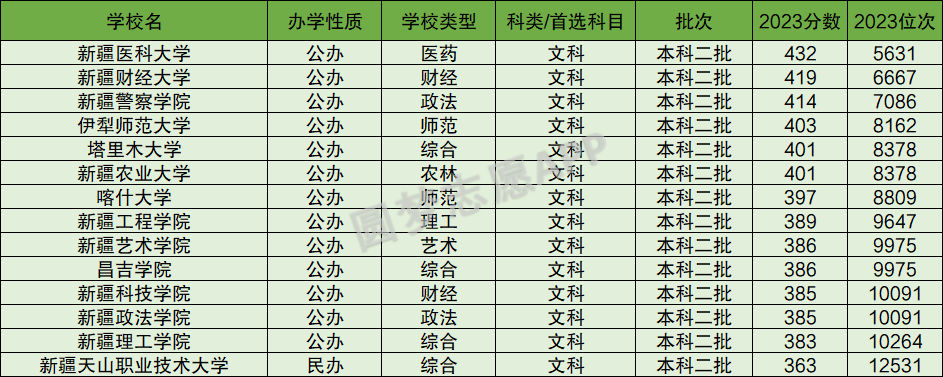 新疆文科中分数最高实力最好的二本大学是新疆医科大学,2023年在新疆最低分为432分,新疆全维吾尔自治区最低位次为5631。