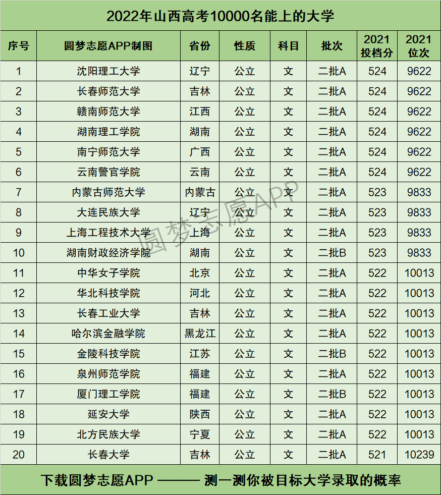 1、本文由于篇幅有限,仅为大家展示了2021年山西高考最低录取位次在一万名附近的20所大学。如果你想查看更多能上的大学,可以直接在手机应用市场下载圆梦志愿APP,获取推荐结果。
