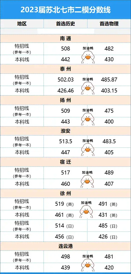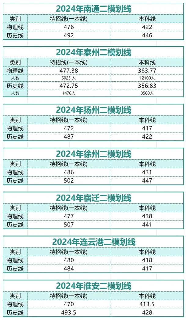 2024年苏北七市高三二模考试已于上周结束,目前南通市、淮安市、扬州市、泰州市、连云港市、徐州市、宿迁市等七市模考分数线划线已出!本次划分了两条分数线,分别是特招线和本科线。