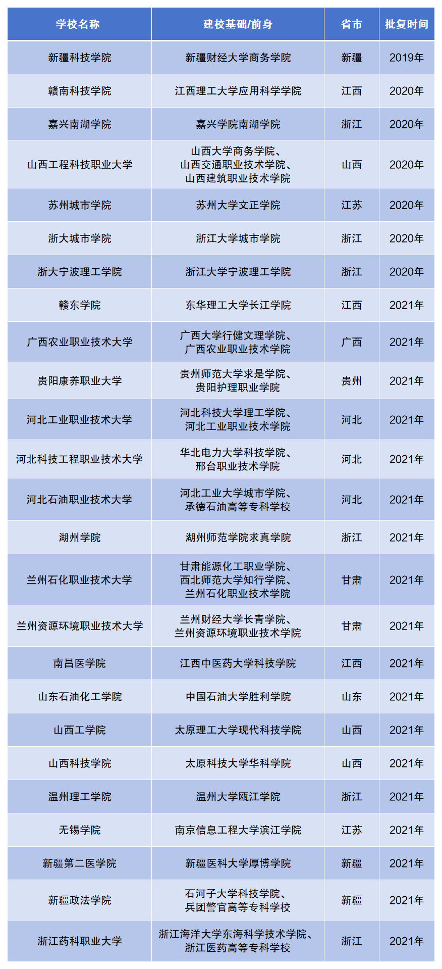 其中大部分都是在2020年和2021年得到教育部批复的,还有10所学校由独立学院跟高职高专合并转设而来,其中9所为职业本科院校。