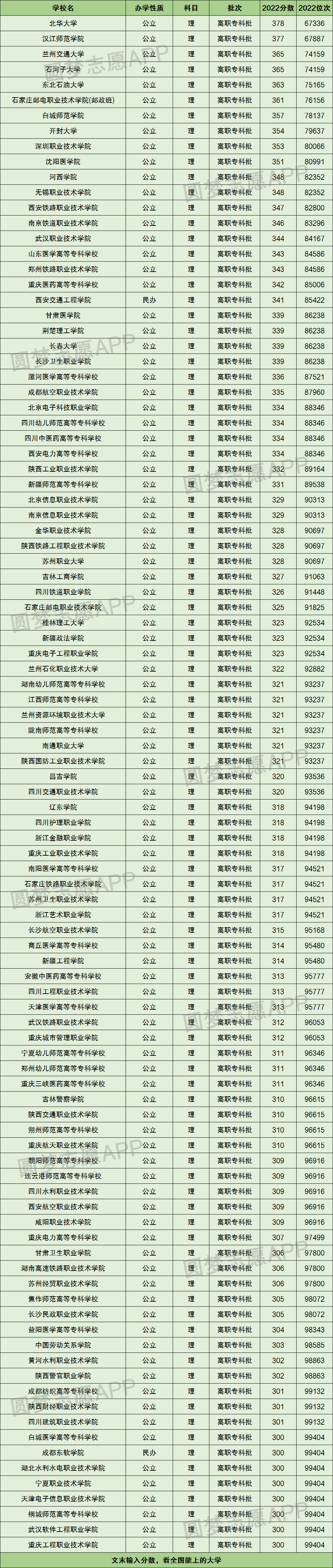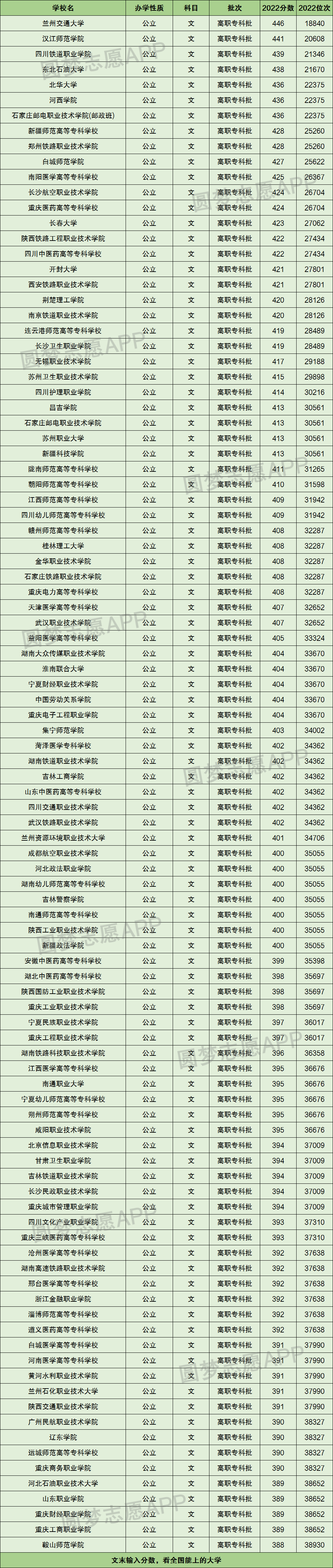 根据2022年全国专科大学在甘肃录取分数线及位次排名情况,小编将分数从高至低进行了排序,具体如下表: