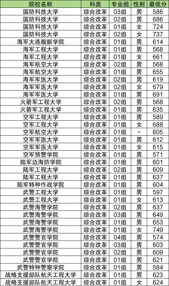 2024年各军校在海南最低录取分数线是: