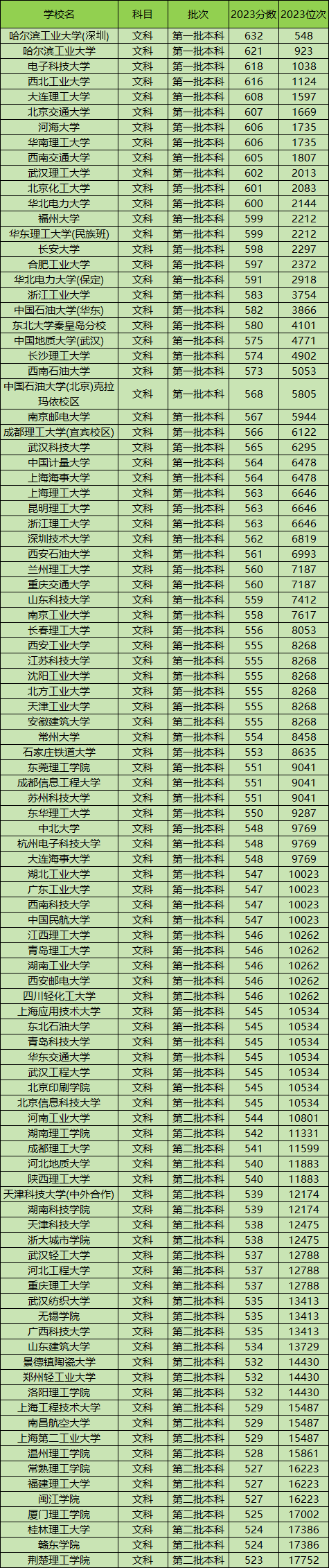 部分理工大学分数线文科榜单一览: