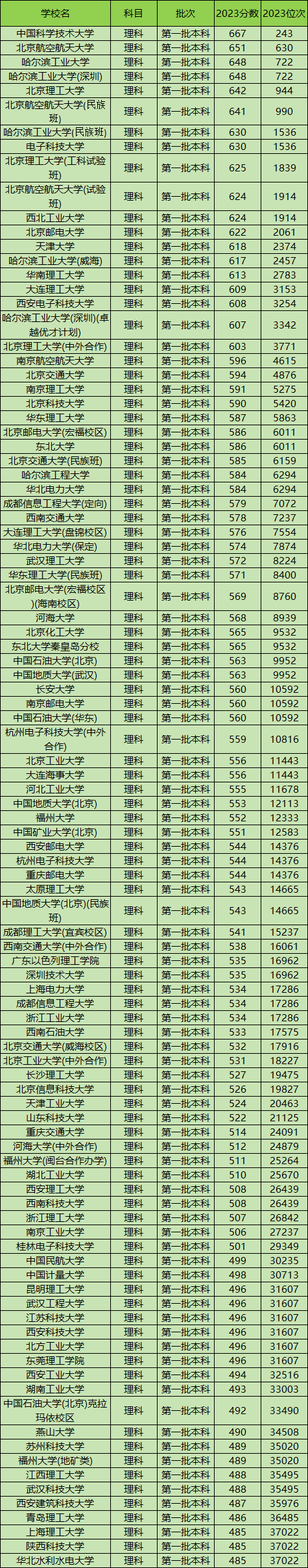 2023年全国一共有296所理工大学理科招生,其中位次排名最高的5所分别是:中国科学技术大学667分(位次243)、北京航空航天大学651分(位次630)、哈尔滨工业大学648分(位次722)、北京理工大学(新工科)642分(位次944)、电子科技大学630分(位次1536)。这5所录取分数线最高,是理科考生最值得上、最好的理工大学。