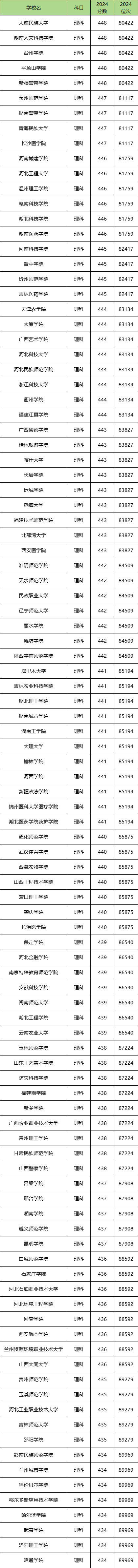 分数最低为滨州医学院、北华航天工业学院、吉林警察学院、安阳师范学院、昆明医科大学海源学院,均为449分。