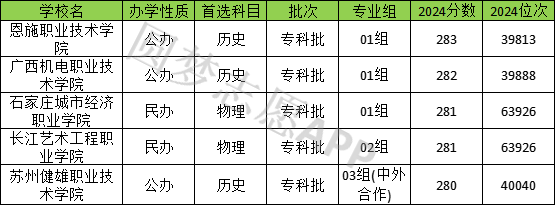 在江苏省280分左右(278分-283分之间)的可以上大学,专科历史类有3所;均为公办院校,有恩施职业技术学院(283分)、广西机电职业技术学院(282分)、苏州健雄职业技术学院(280分)。