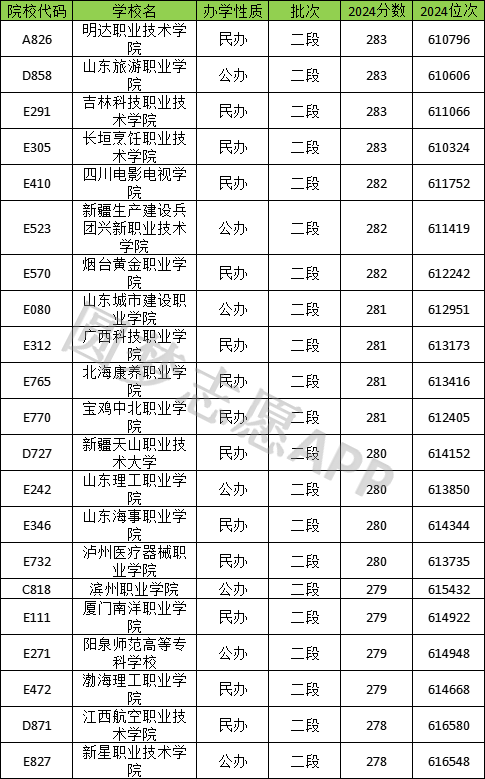 在山东省280分左右(278分-283分之间)的可以上大学有21所,其中公办院校7所,在山东二段录取的有新疆生产建设兵团兴新职业技术学院(282分)、山东理工职业学院(280)、滨州职业学院(279分)等。民办院校14所,有四川电影电视学院(282分)、广西科技职业学院(281分)、厦门南洋职业学院(279分)等。
