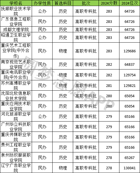 在重庆市280分左右(278分-283分之间)能上的大学,历史类有12所,有抚顺职业技术学院(283分)、广东信息工程职业学院(283分)、成都文理学院(283分)等。