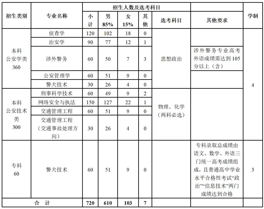 其中公安类专业招生总数为720人,不同专业的招生计划详情见下: