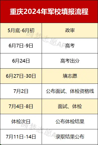 2025年重庆军校报考流程主要包括填报志愿(6月27日-30日)、政审(5月底-6月初)、面试体检(7月4日-8日)等。想要报考军校需要满足未婚、年龄16到20岁、符合军队院校体检标准等条件。完整流程及时间安排表如下。