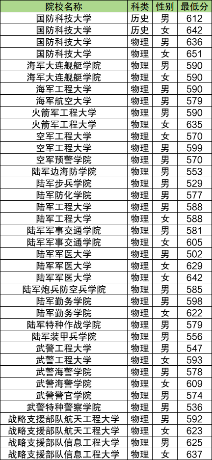 2024年各军校在重庆最低录取分数线是: