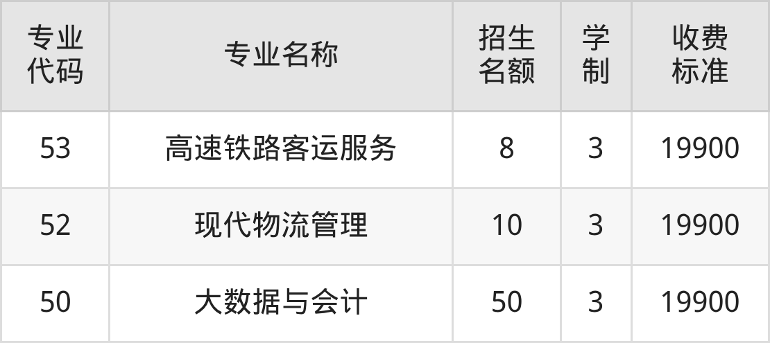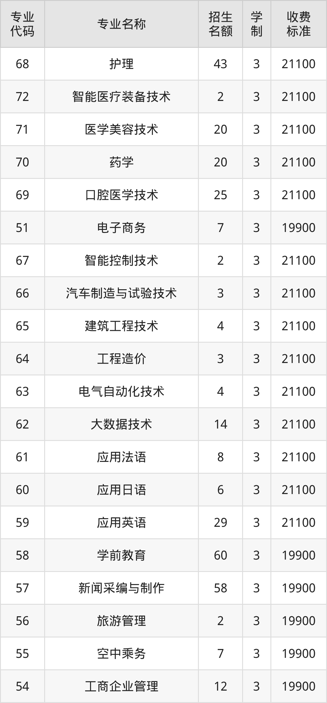 | 专业 代码 | 专业名称 | 招生 名额 | 学 制 | 收费 标准 |