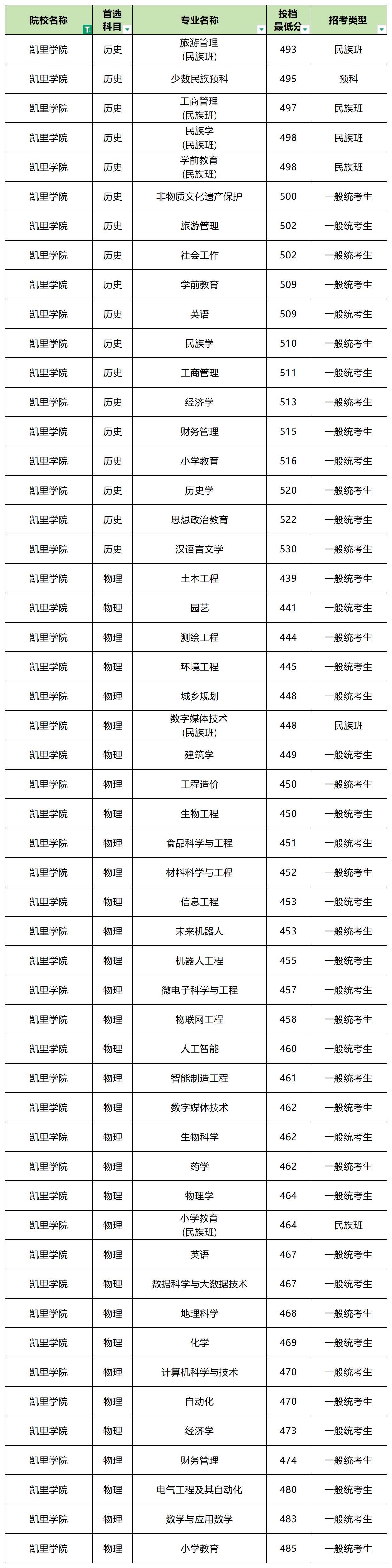 2025年凯里学院最低分数线: