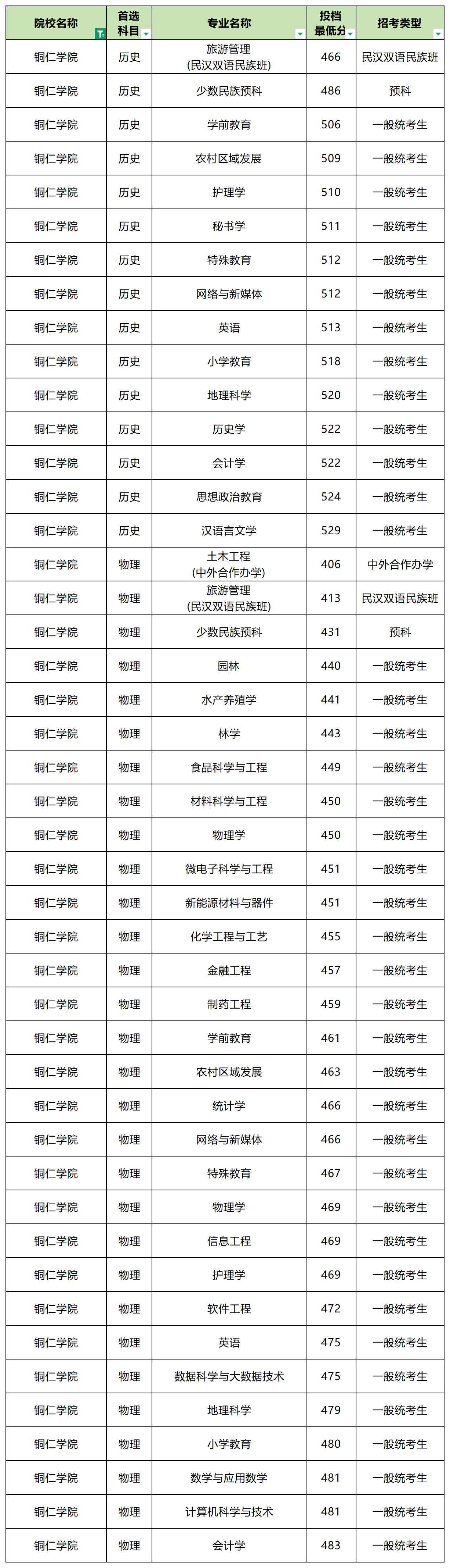 2025年铜仁学院最低分数线: