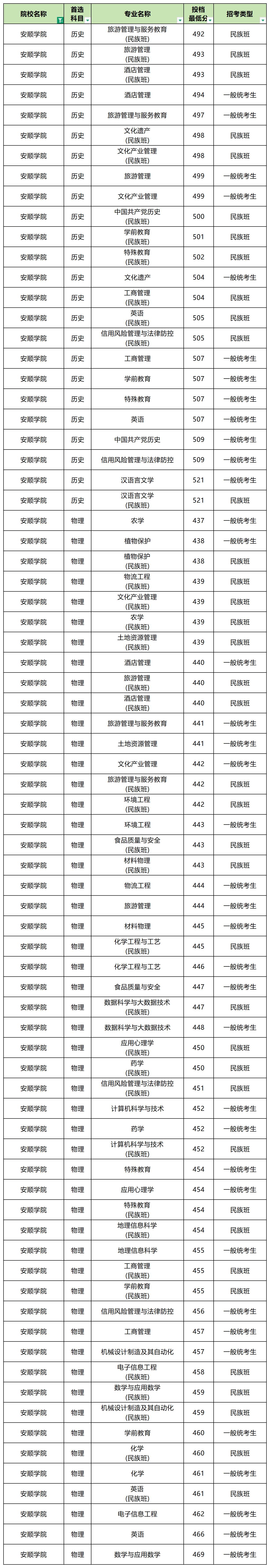 2025年安顺学院最低分数线: