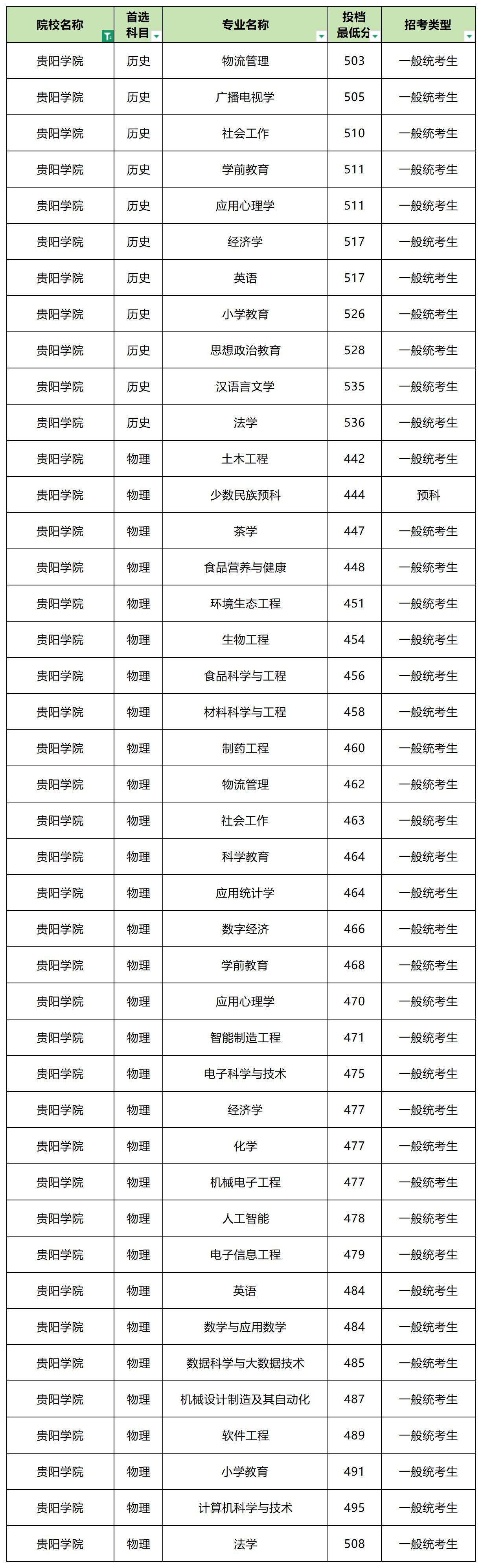 2025年贵阳学院最低分数线: