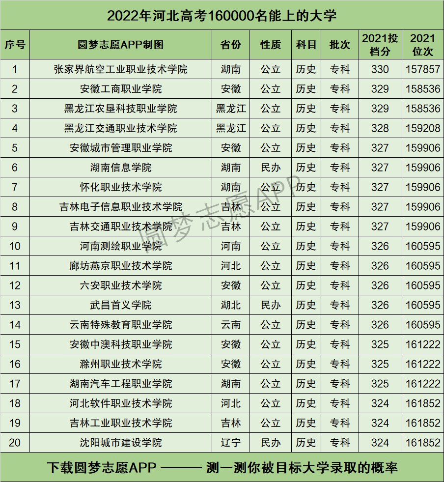 1、本文由于篇幅有限,仅为大家展示了2021年河北高考最低录取位次在十六万名附近的20所大学。如果你想查看更多能上的大学,可以直接在手机应用市场下载圆梦志愿APP,获取推荐结果。