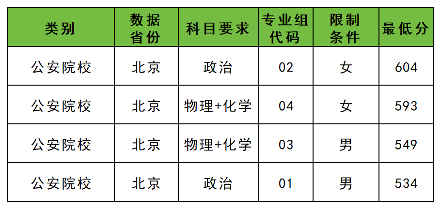 比如在北京,北京警察学院录取最低分是534分,但这只是选考政治科目男生的最低分,如果是选考政治科目女生的话最低分可达604分,如果是选考物理+化学科目的女生,最低分高达593分。
