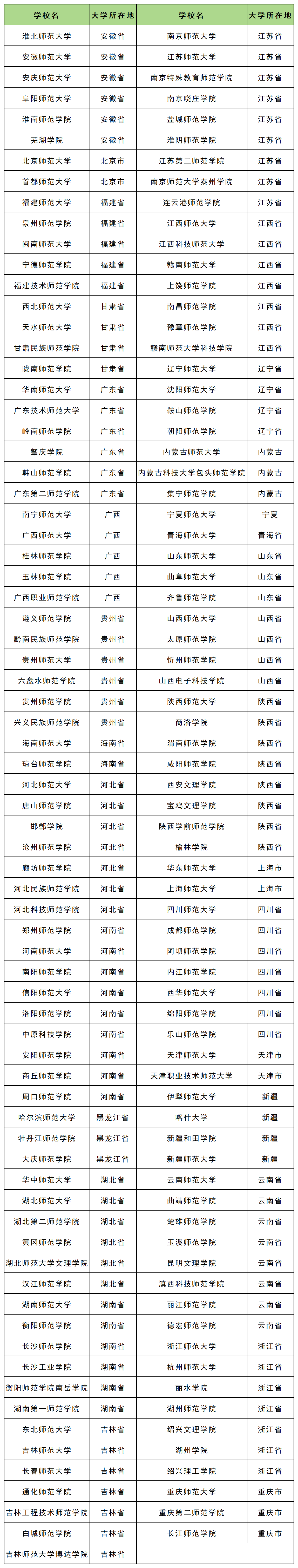 湖北省:华中师范大学、湖北师范大学、湖北第二师范学院、黄冈师范学院等。